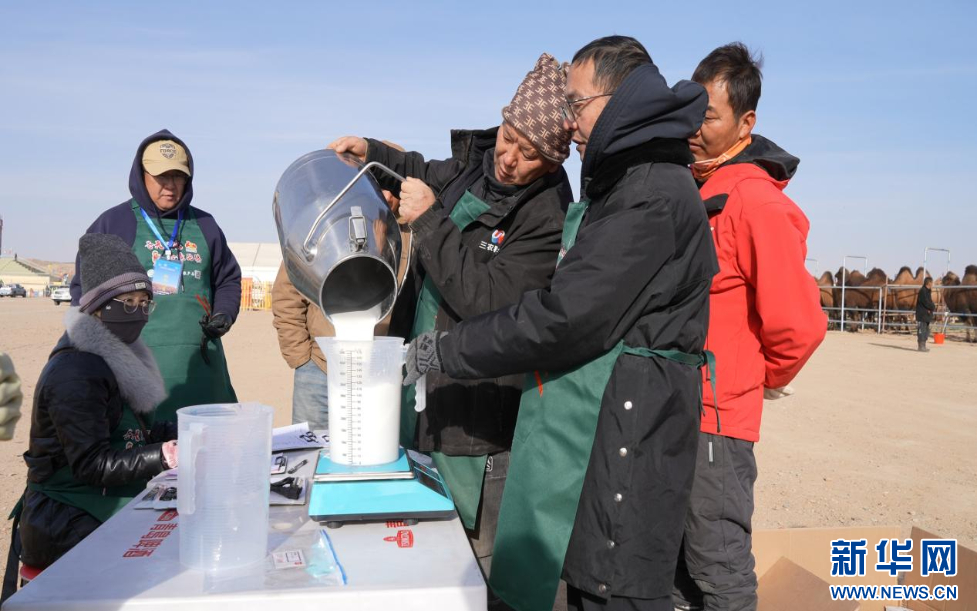 工作人员计算单峰骆驼挤奶量。新华网发