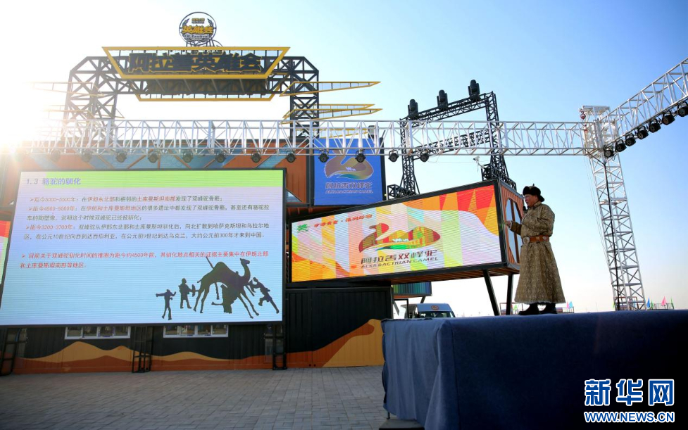 吉日木图为参与挑战吉尼斯世界纪录的牧民群众讲授骑骆驼课程。新华网 杨腾格尔摄