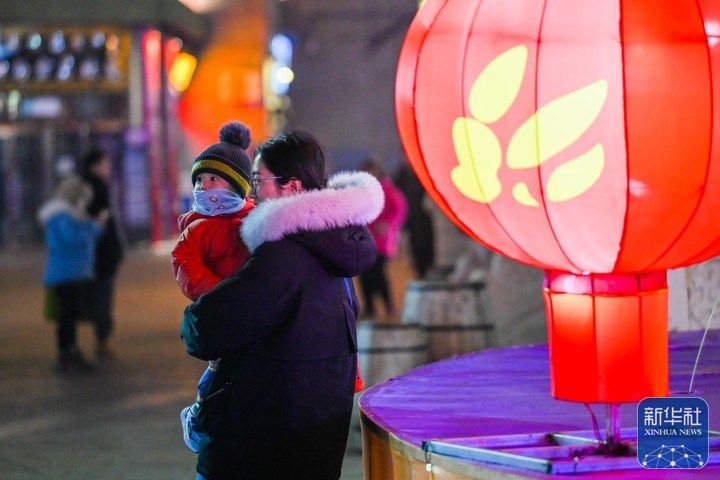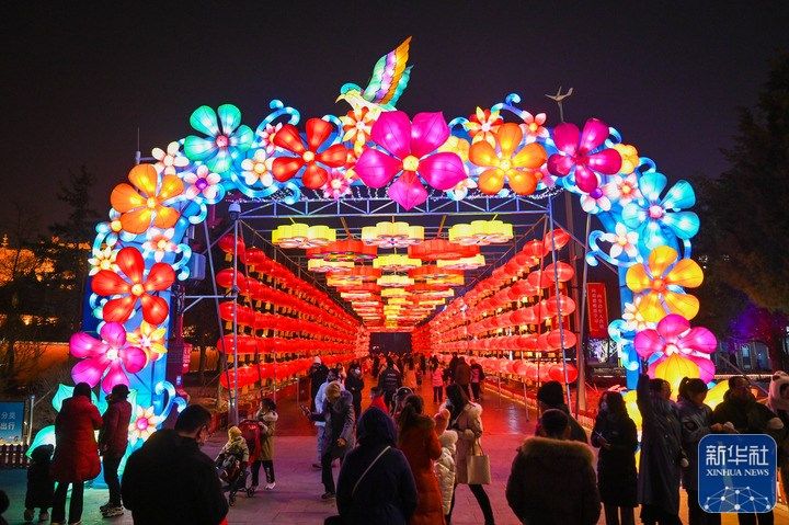 12月29日,市民在呼和浩特市大召广场的灯笼通道里观赏游玩。新华社记者刘磊摄