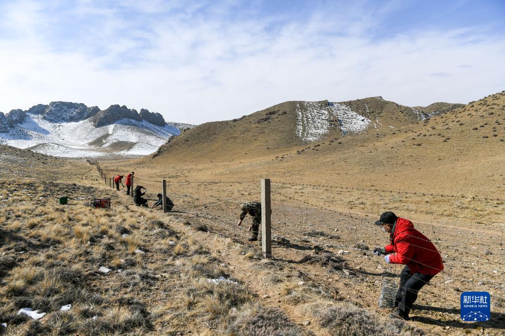 2月17日,哈拉乌管理站门洞子管护站的管护员在修理防护栏。新华社记者贝赫摄
