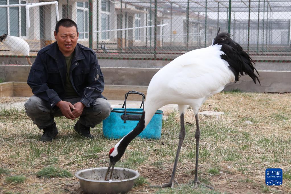 5月11日,徐沃德乐胡在观察救助的丹顶鹤进食。新华社记者王楷焱摄