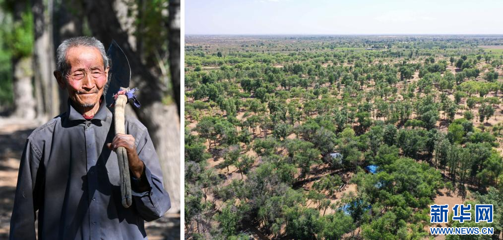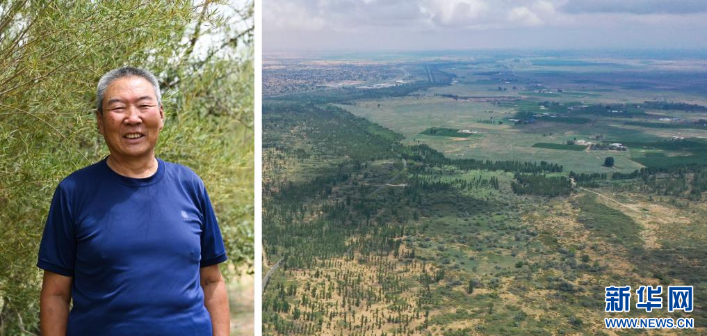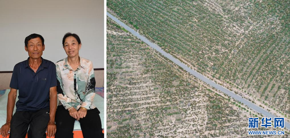 这是一张拼版照片。左图为内蒙古达拉特旗官井村村民高二云和妻子的合影(8月11日摄);右图为高二云夫妻在库布其沙漠中种植的柠条(8月11日摄,无人机照片)。新华社记者刘磊摄