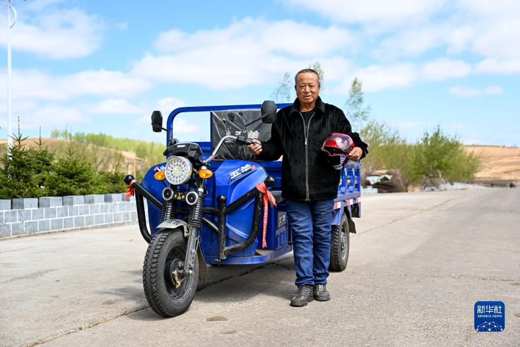 这是5月13日拍摄的于庆柱与他运送快递的三轮车的合影。新华社记者李志鹏摄
