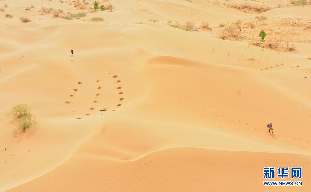 治沙客在内蒙古库布其沙漠亿利生态治理区种植苗木(4月27日摄,无人机照片)。新华社记者刘磊摄