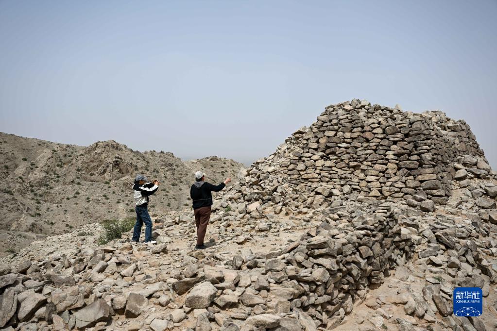 5月13日,驼峰(长城)文物保护队员娜仁图雅(左)和乌仁其其格在巡查阿拉善左旗一处烽火台遗址。新华社记者贝赫摄