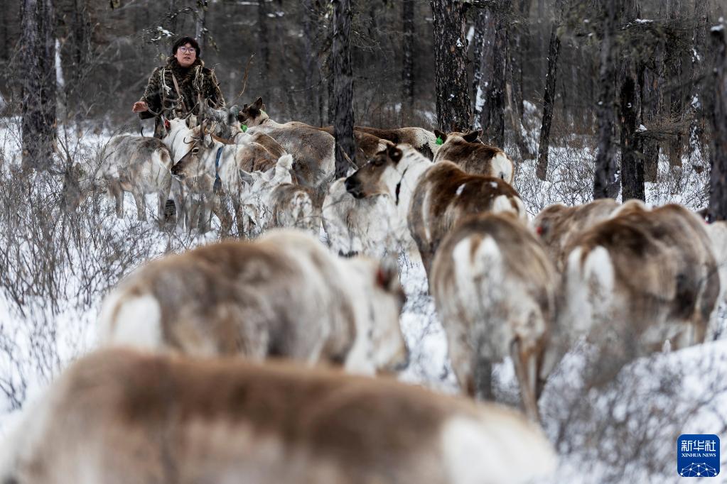 1月12日,觉乐召唤鹿群,想让鹿群和自己一起返回驯鹿点。新华社记者费茂华摄