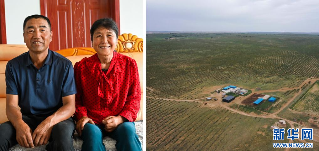这是一张拼版照片。左图为内蒙古达拉特旗官井村村民周志忠和妻子的合影(8月11日摄);右图为周志忠位于库布其沙漠中的房屋(8月11日摄,无人机照片)。周志忠一家人在库布其沙漠边缘拥有8000多亩草场。1998年,周志忠开始种植灌木治理沙漠改良草场。新华社记者刘磊摄