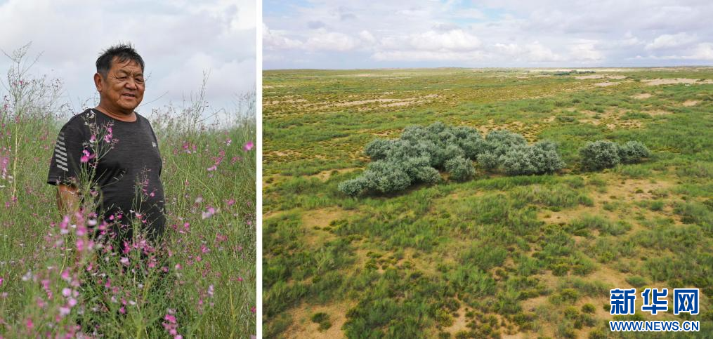 这是一张拼版照片。左图为内蒙古杭锦旗道图嘎查原支部书记陈宁布在自家草场留影(7月21日摄)。右图为内蒙古杭锦旗道图嘎查的植被(7月21日,无人机照片)。新华社记者刘磊摄