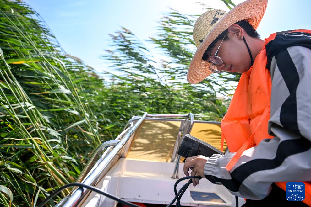 9月15日,在乌梁素海湖面上,武蓉测量水质。新华社记者邢广利摄