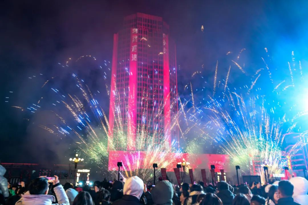当新年钟声敲响的那一刻,绚烂的烟花在新华广场上空绽放。一时间,整个广场响起了人们的喝彩声,新的一年开始了!