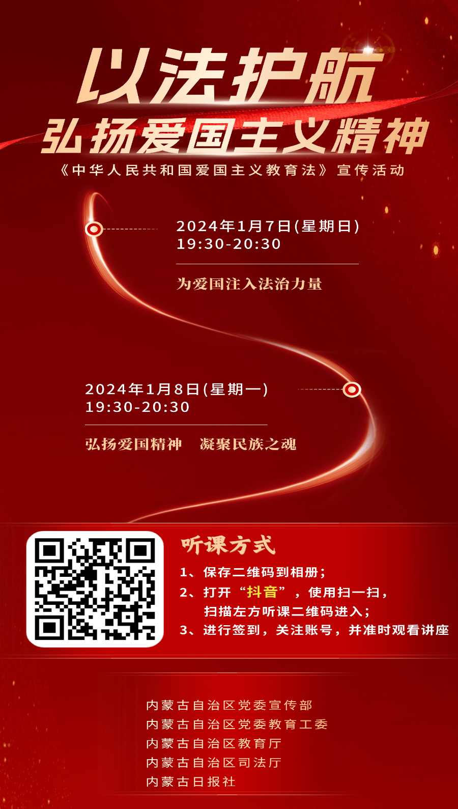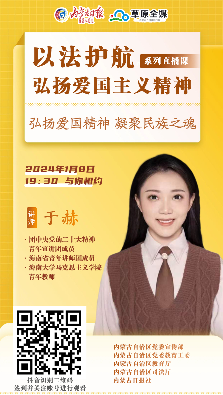 《中华人民共和国爱国主义教育法》自2024年1月1日起施行,为进一步弘扬爱国主义精神,加强全区爱国主义教育,落实普法责任,内蒙古自治区党委宣传部、内蒙古自治区党委教育工委、内蒙古自治区教育厅、内蒙古自治区司法厅、内蒙古日报社策划推出了“以法护航,弘扬爱国主义精神”系列直播课。