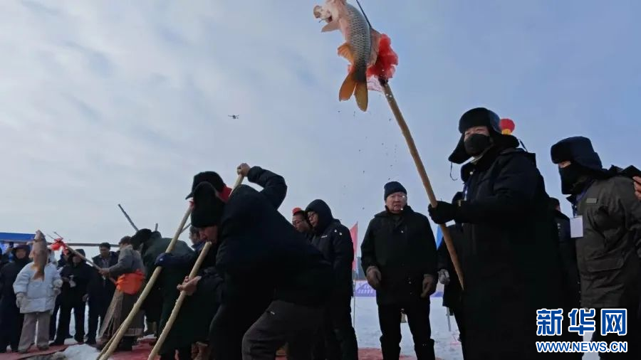 莫力达瓦冰钓季活动中,人们在叉鱼。新华网发(李霞 摄)