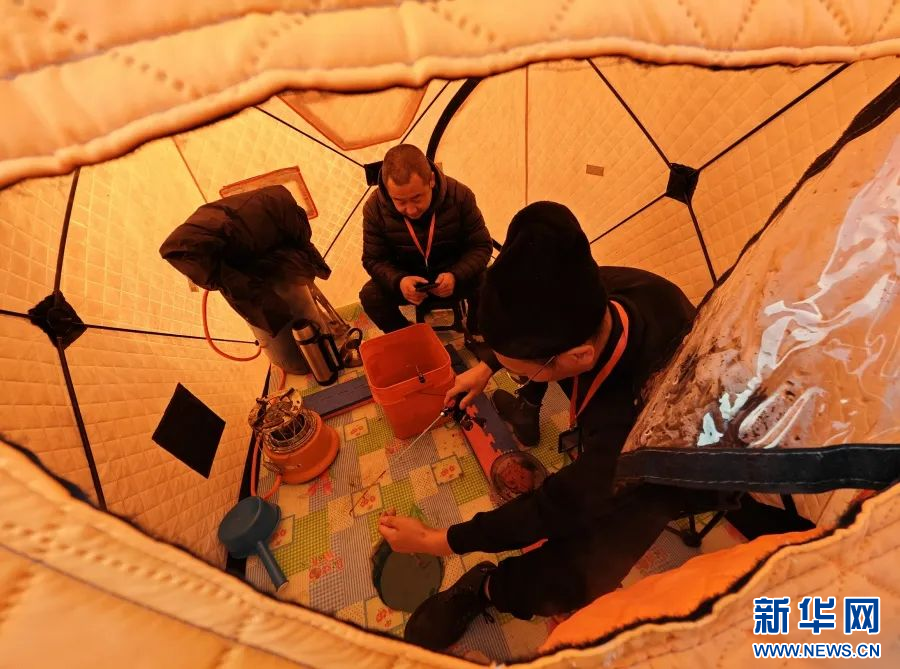 在莫力达瓦冰钓季上,一组参赛选手正在冰钓比赛中。新华网发(李霞 摄)