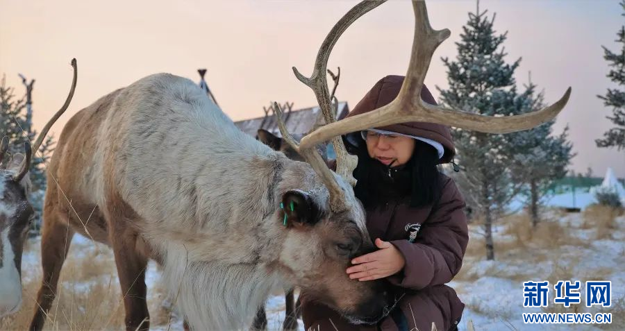 在敖鲁古雅,和森林精灵驯鹿亲密接触。新华网发(李新军 摄)