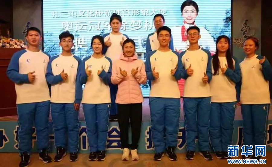 徐梦桃受聘成为扎兰屯文旅体形象大使,聘任仪式后,与“十四冬”志愿者“小雪团”合影。新华网发(李新军 摄)