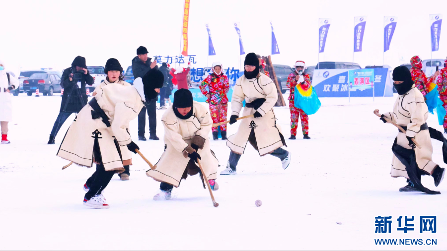 在莫力达瓦冰钓季上,曲棍球展示吸引人们的目光。新华网发(李新军 摄)