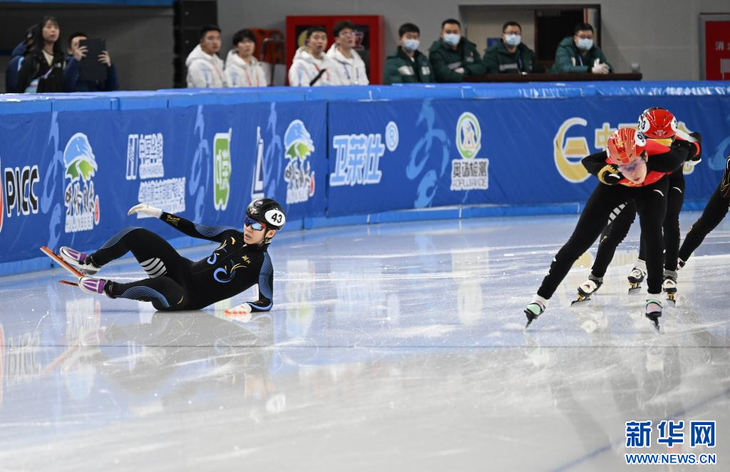 1月11日,湖北队选手孔伟琪(左一)在女子1500米四分之一决赛中摔倒。