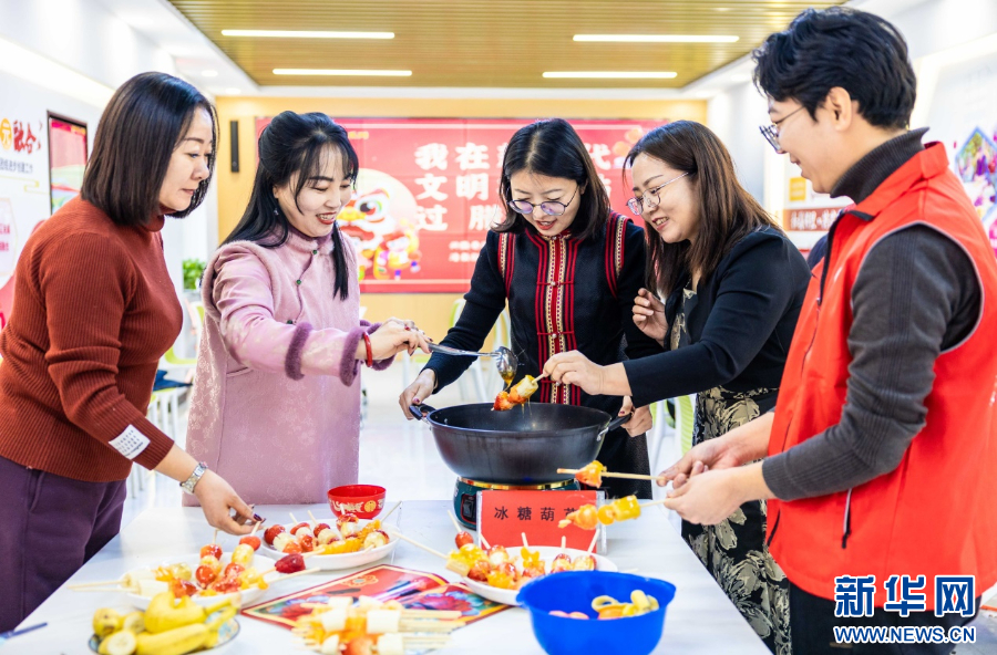 1月17日,呼和浩特市玉泉区清泉街社区志愿者和居民在制作冰糖葫芦。新华网发(丁根厚 摄)