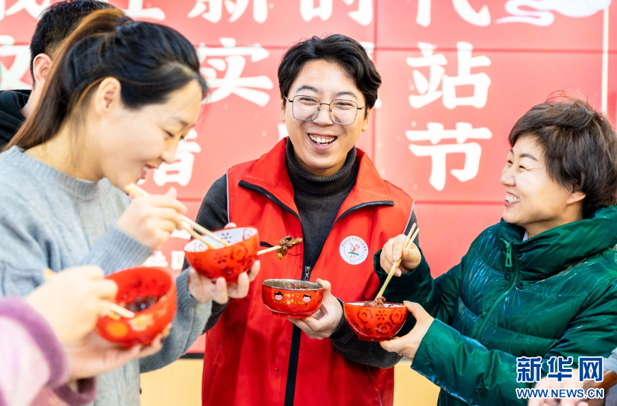 1月17日,呼和浩特市玉泉区清泉街社区志愿者和居民在品尝现场熬制的腊八粥。新华网发(丁根厚 摄)
