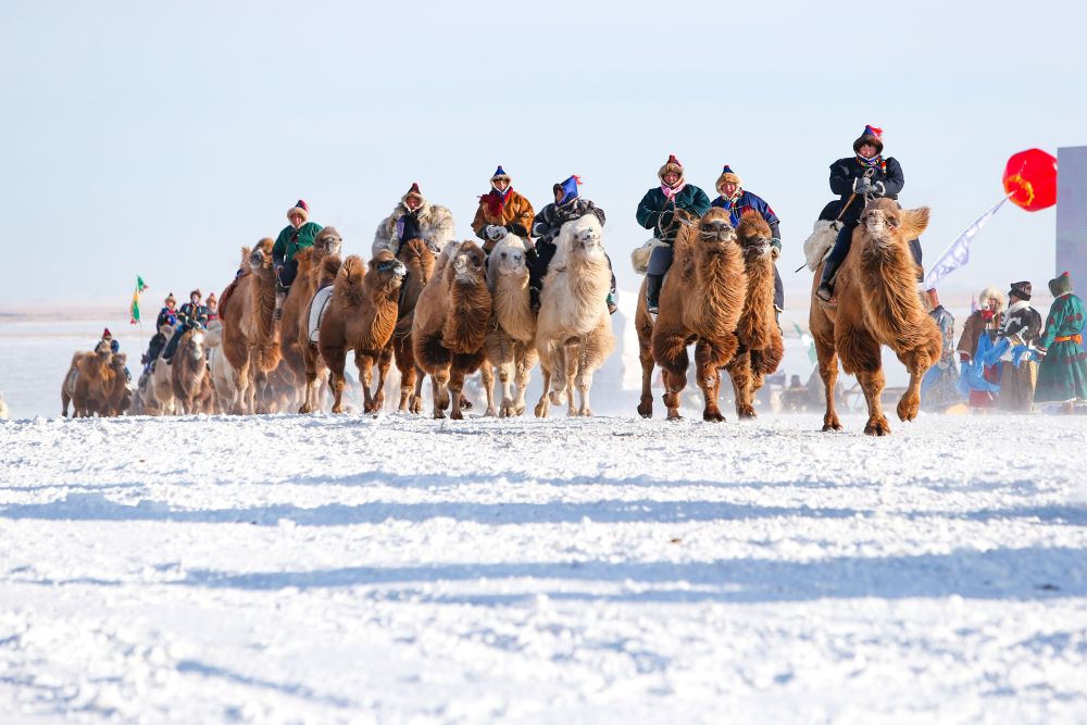 2018年12月23日,骆驼队在开幕式上入场。当日,第十六届内蒙古冰雪那达慕在呼伦贝尔市开幕。(虞东升 摄)