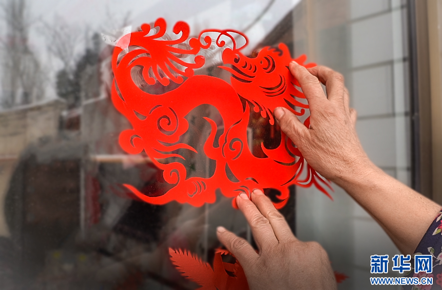 1月22日,剪纸艺人将“龙”样窗花贴到窗户上。新华网发(李伯伦 摄)