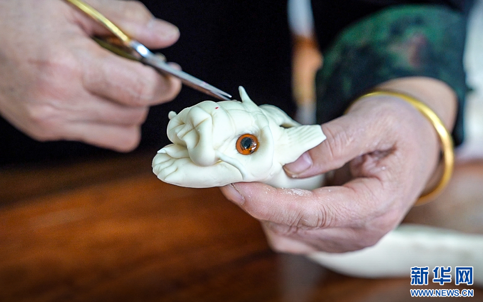 1月22日,手工艺人处理“龙”样面塑细节。新华网发(赵天宇 摄)
