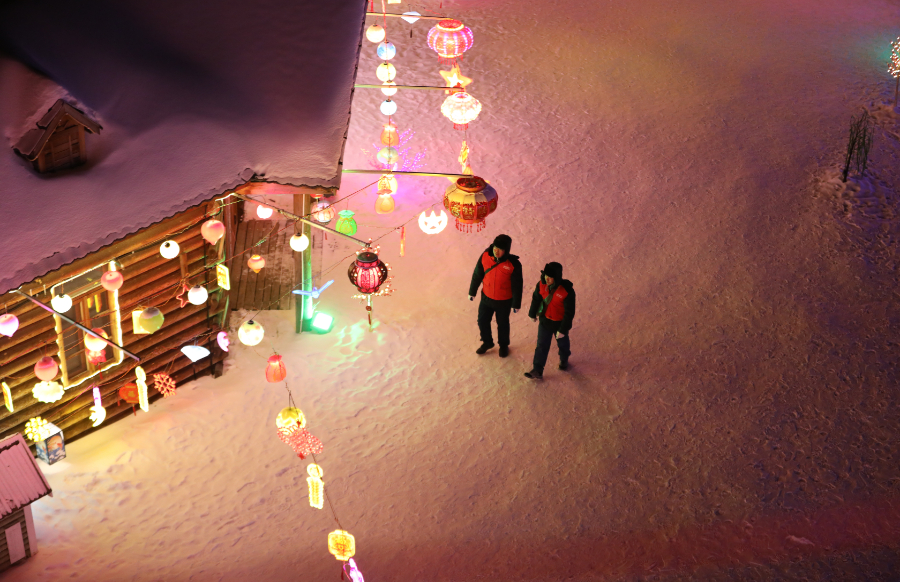 夜幕降临,滑雪场的游客们在结束滑雪之行后纷纷涌向节日气氛浓厚的雪村,兴奋地在各式各样的雪雕前拍照留念。充满年味的红灯笼和花灯交相呼应,映亮了一片夜空。