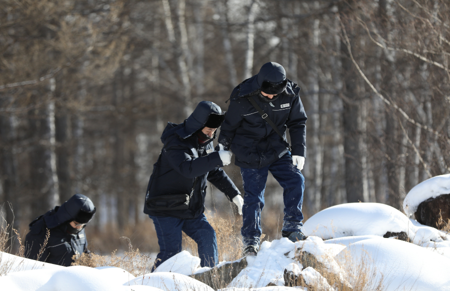 国家电网蒙东电力蒙古马(阿尔山)共产党员服务队队员来到阿尔山雪村巡检线路、设备。