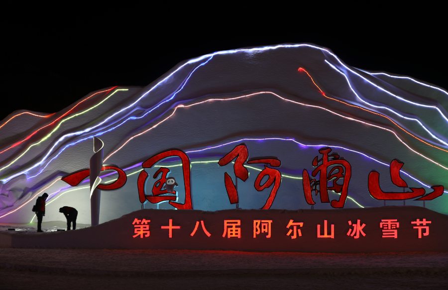 国家电网蒙东电力蒙古马(阿尔山)共产党员服务队队员来到阿尔山市雪雕园检查景观照明线路。