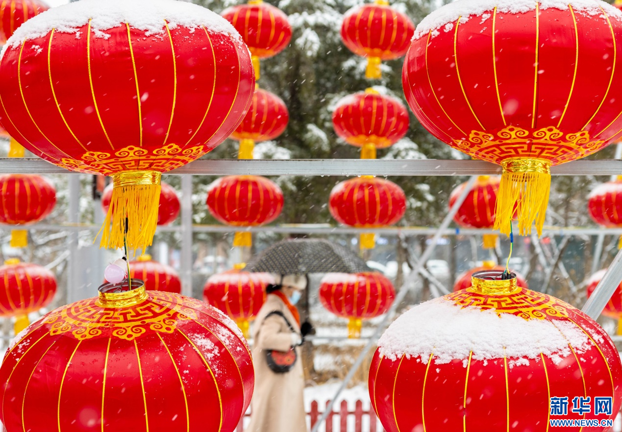 1月19日,游人冒雪在呼和浩特市玉泉区塞上老街旅游休闲街区灯笼长廊内游玩。新华网发(丁根厚 摄)