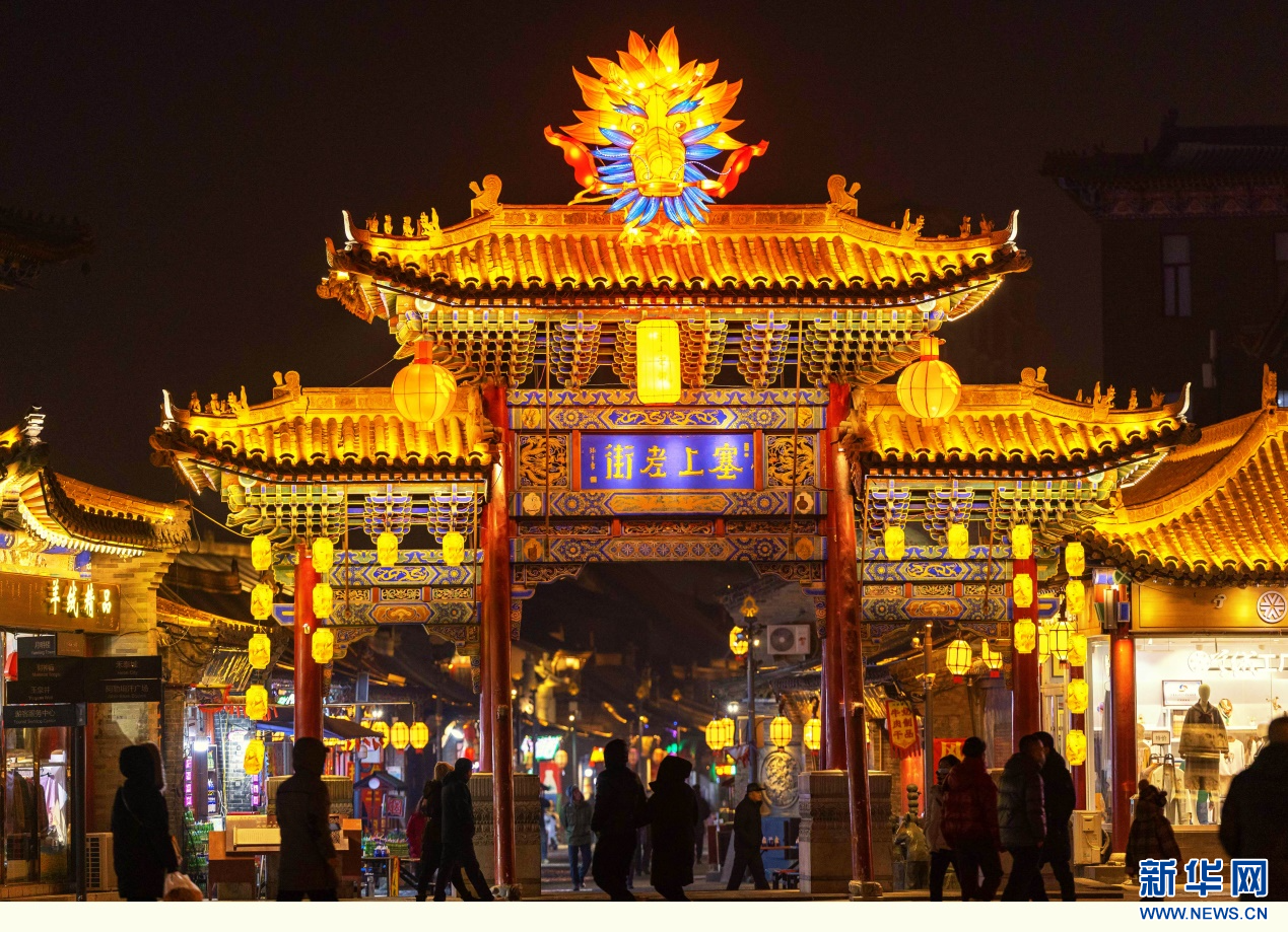 2月3日,游人在内蒙古呼和浩特市玉泉区塞上老街旅游休闲街区游玩赏灯。新华网发(丁根厚 摄)