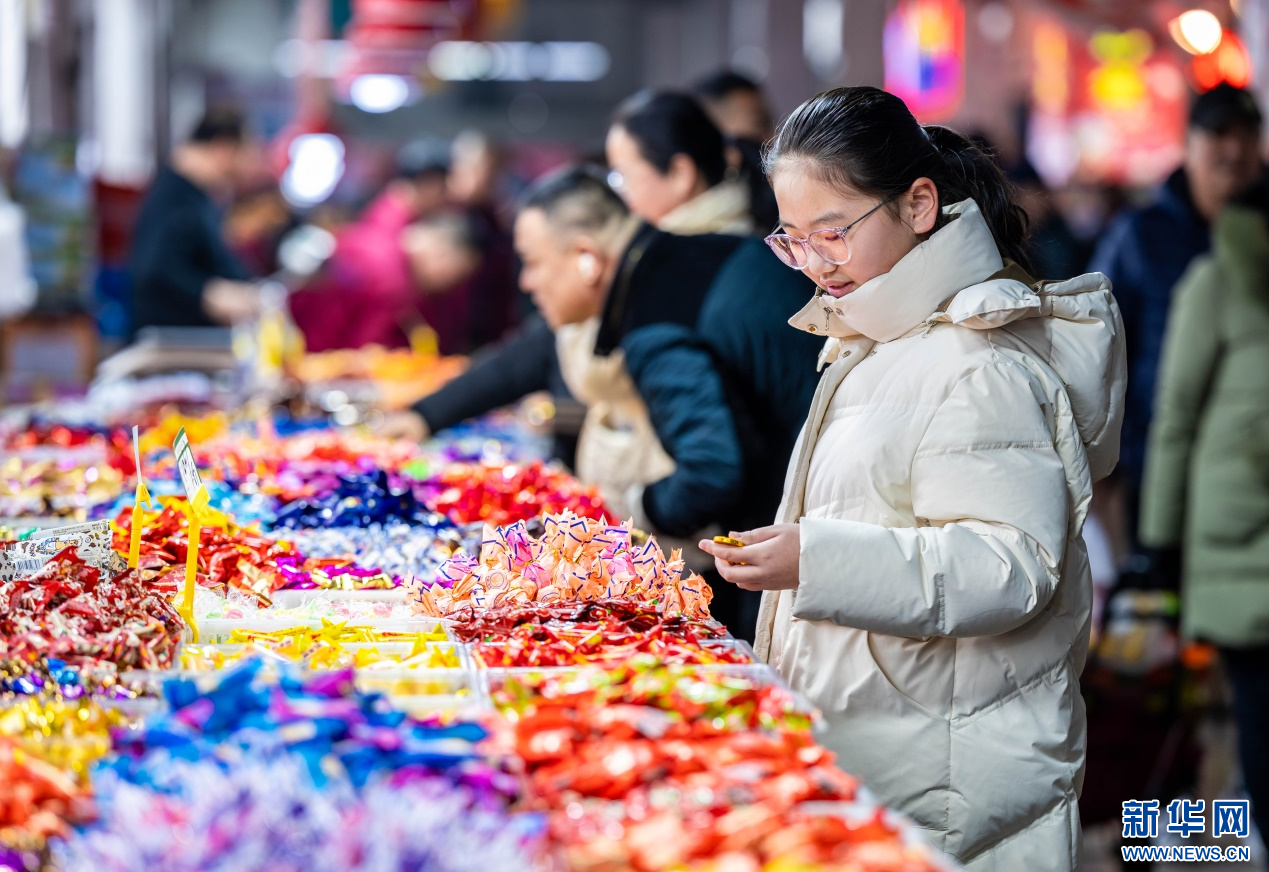 2月5日,顾客在内蒙古呼和浩特市玉泉区美通批发市场年货节上选购糖果。新华网发(丁根厚 摄)