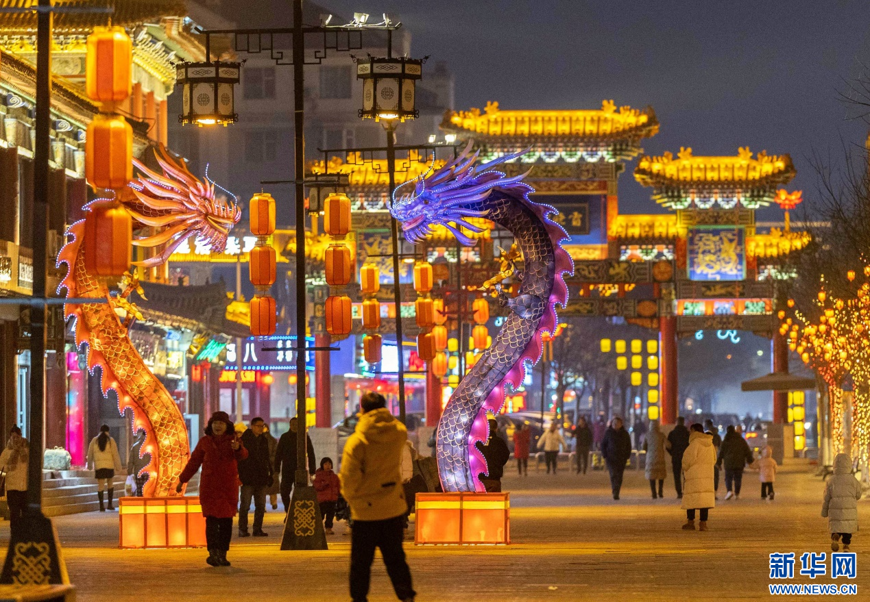 2月3日,游人在内蒙古呼和浩特市玉泉区塞上老街旅游休闲街区观赏双龙造型的灯组。新华网发(丁根厚 摄)