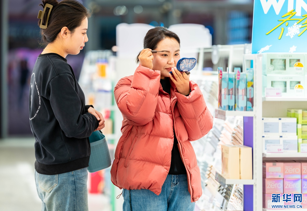 2月1日,市民在内蒙古呼和浩特市玉泉区凯德茂购物中心试用化妆品。新华网发(丁根厚 摄)