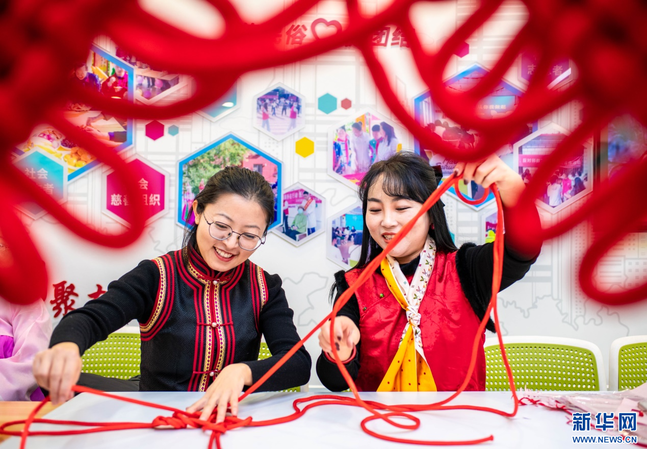 2月2日,社区居民和志愿者在内蒙古呼和浩特市玉泉区清泉街社区编制中国结。新华网发(丁根厚 摄)