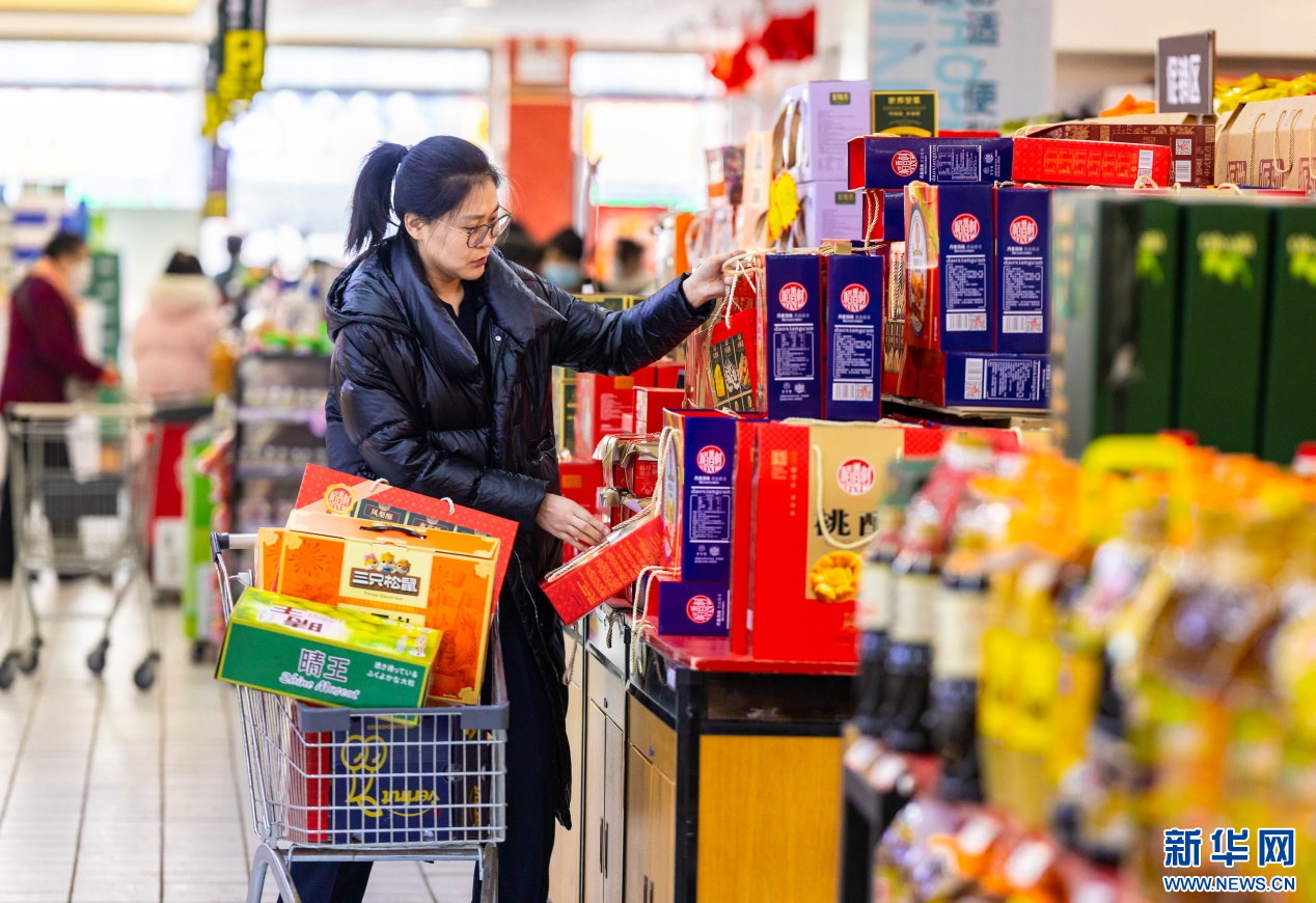 2月5日,顾客在内蒙古呼和浩特市玉泉区美通批发市场食全食美超市选购年货礼品。新华网发(丁根厚 摄)