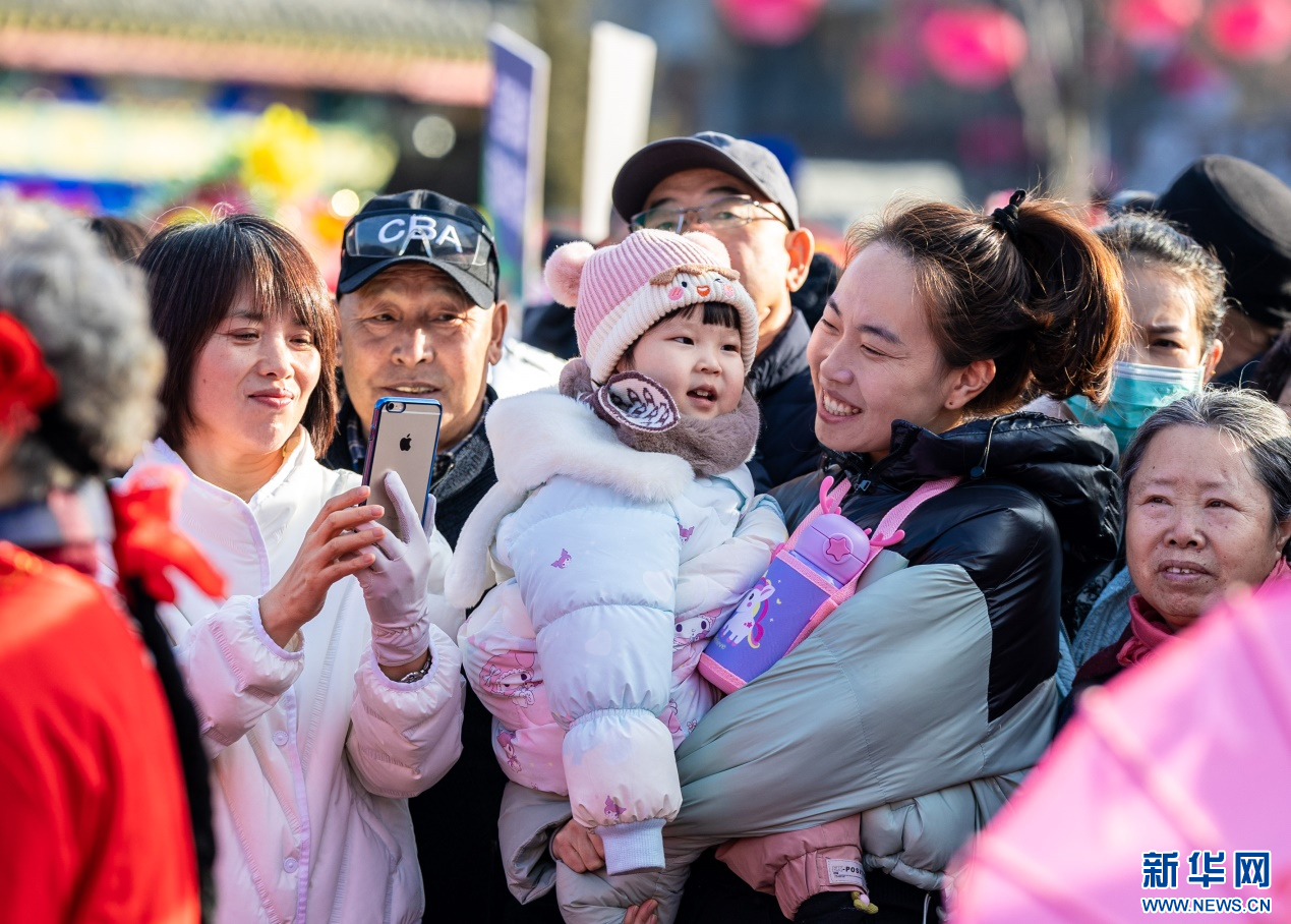 2月17日,家长陪伴孩子在呼和浩特市玉泉区塞上老街旅游休闲街区观看社火表演。新华网发(丁根厚 摄)