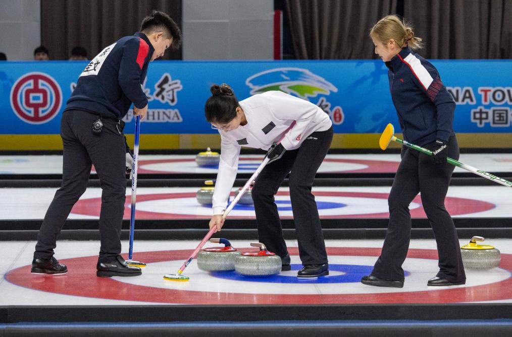 14日,“十四冬”冰壶(公开组)比赛正式开赛,备受关注的东道主内蒙古队取得“开门红”,他们以10:5战胜重庆队。