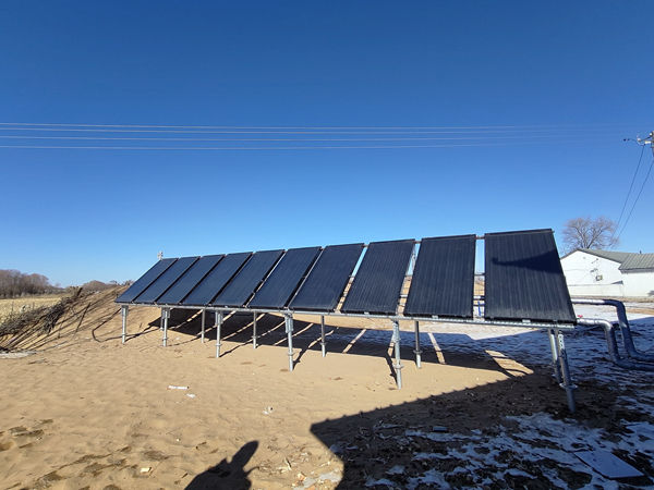 布勒德指着屋子里取暖设备的显示屏向记者展示,室内温度已经达到25摄氏度。顺着布勒德手指向窗外望去,院子里一片深黑色的太阳能光热集热板在阳光下安静工作,将太阳光热能直接转化为供暖热能。