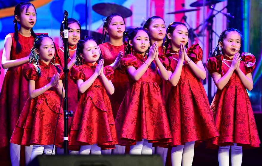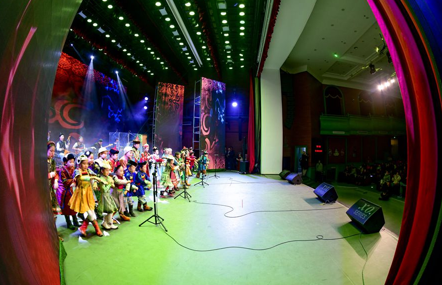 2月21日晚,呼伦贝尔五彩儿童合唱团演出现场。新华网发(王正 摄)