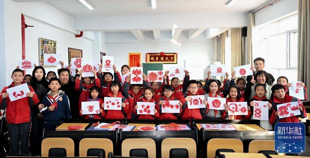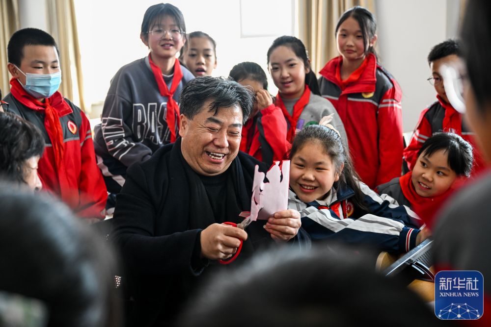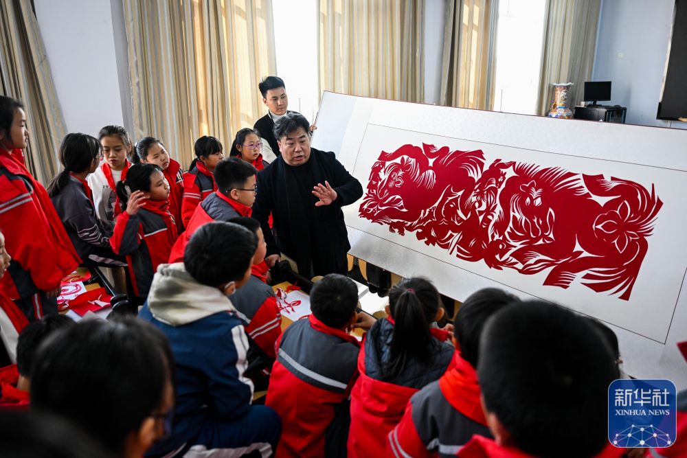 ↑3月14日,段建珺(中)在和林格尔县第二小学向小学生讲解剪纸技艺。新华社记者李志鹏摄