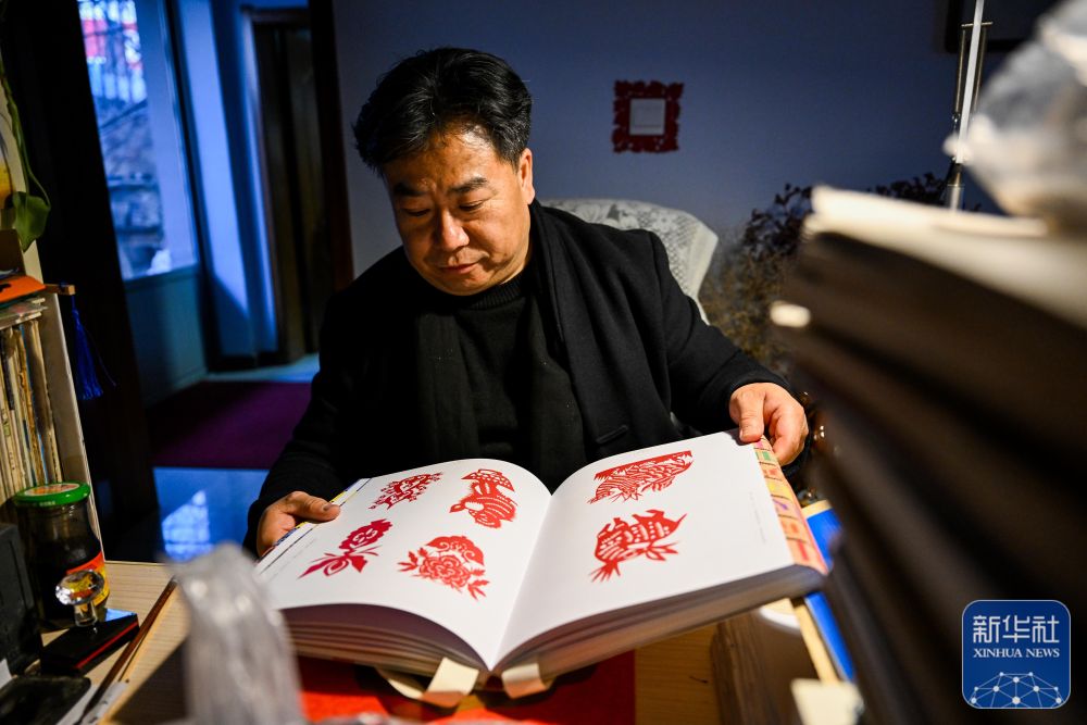 ↑3月14日,段建珺在家中翻阅剪纸书籍。新华社记者李志鹏摄