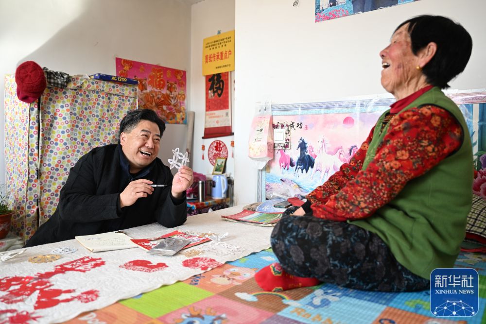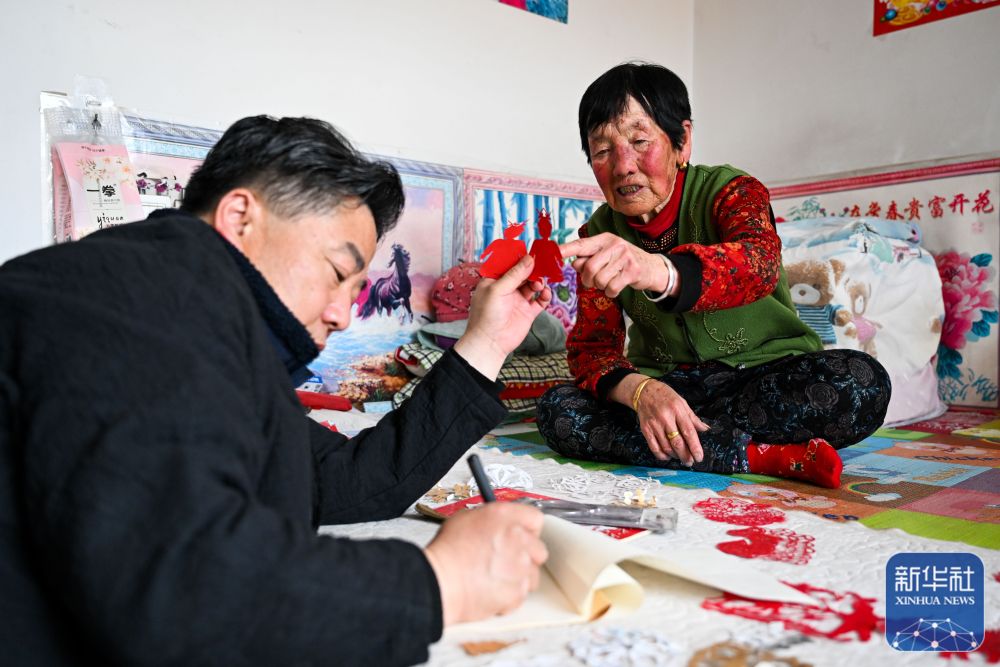 ↑3月15日,段建珺(左)在和林格尔县羊群沟乡记录当地老人梁巧连的剪纸作品特点。新华社记者李志鹏摄