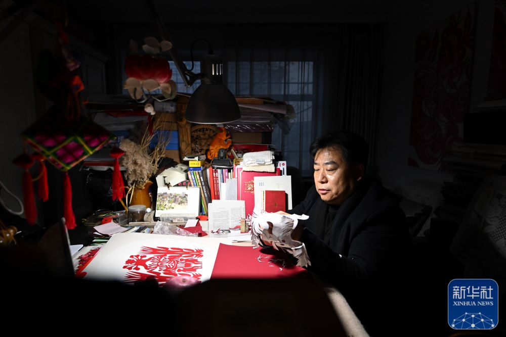 ↑3月14日,段建珺在位于内蒙古呼和浩特市和林格尔县的家中创作剪纸作品。新华社记者贝赫摄