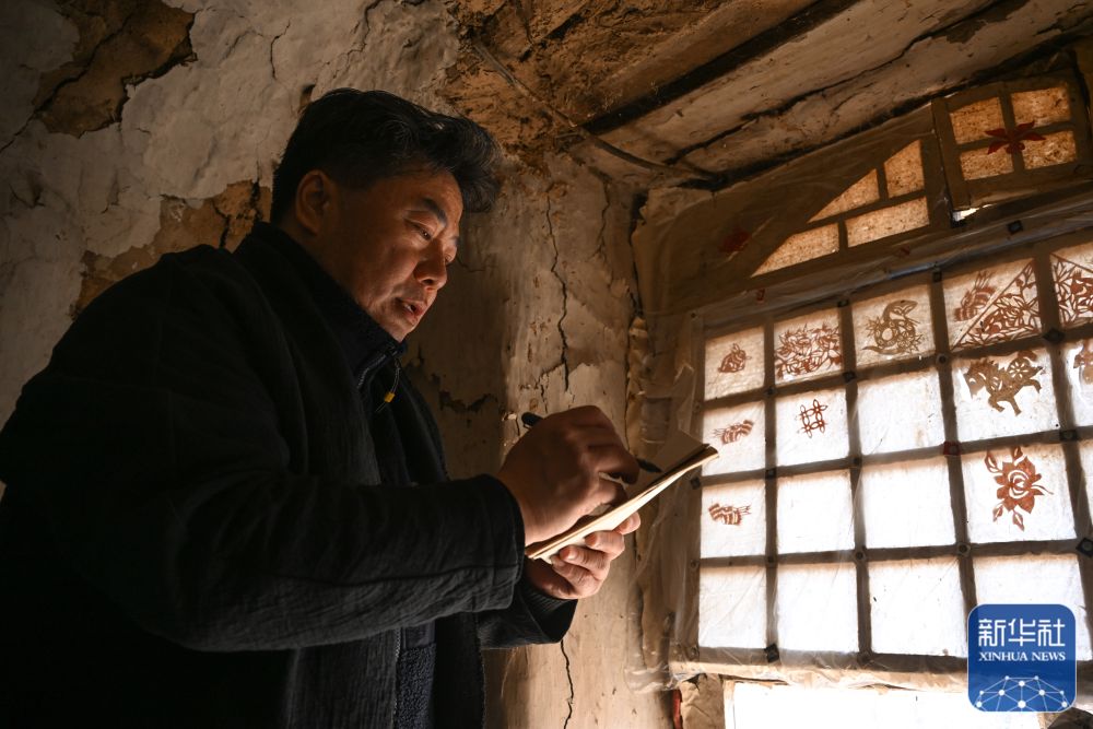 ↑段建珺在内蒙古呼和浩特市和林格尔县羊群沟乡梁巧连故居中记录剪纸图样(3月15日摄)。新华社记者贝赫摄