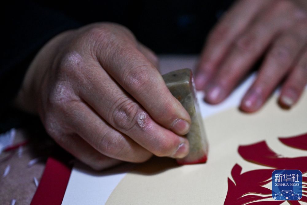 ↑3月14日,段建珺在家中给剪纸作品盖章。由于长年剪纸,段建珺的手上长出了老茧。新华社记者李志鹏摄
