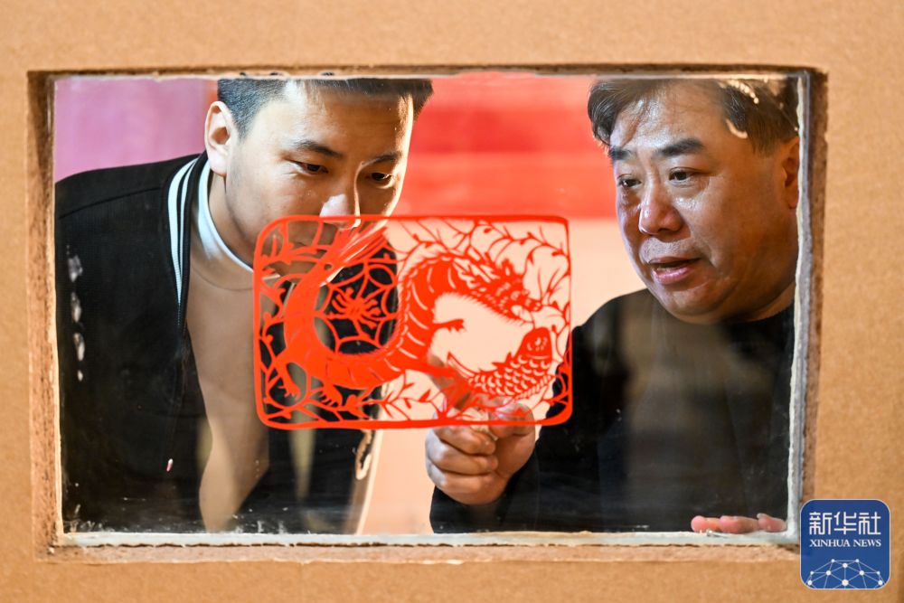 ↑3月14日,段建珺(右)在和林格尔剪纸陈列馆与徒弟包志明参观剪纸展品。新华社记者李志鹏摄