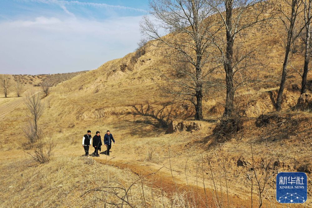 ↑3月15日,段建珺(中)走在和林格尔县羊群沟乡的乡村道路上(无人机照片)。新华社记者李志鹏摄