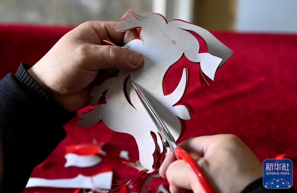 ↑段建珺在和林格尔剪纸传习所内创作剪纸(3月14日摄)。新华社记者贝赫摄