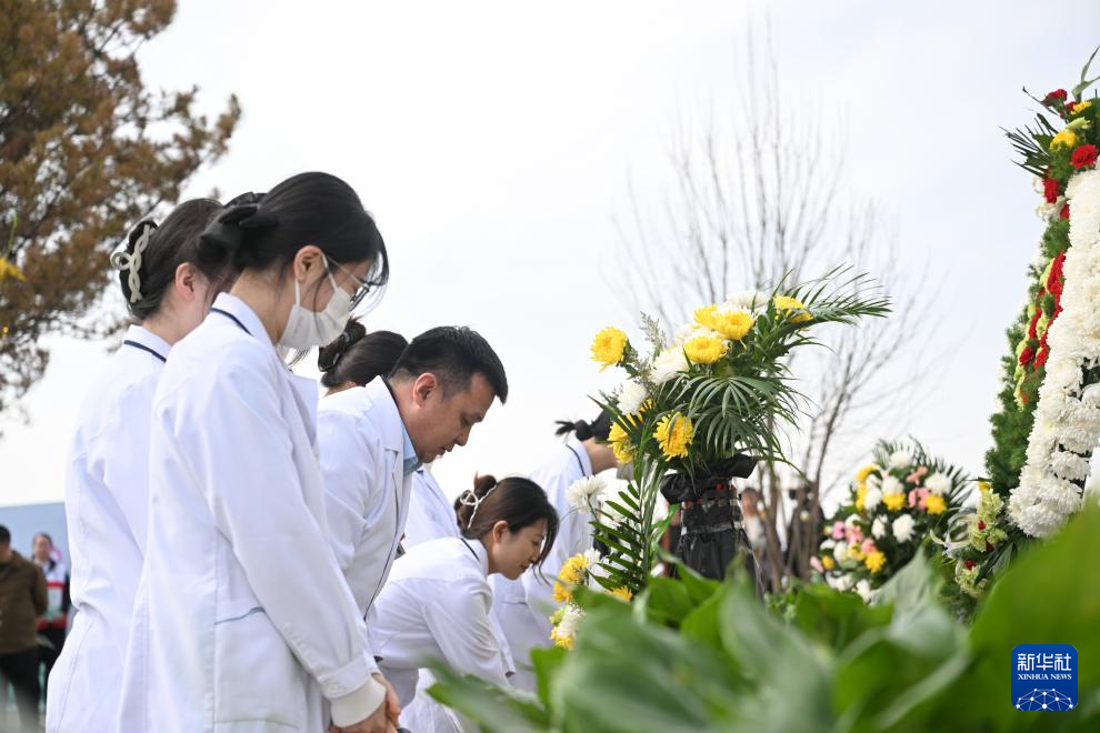 4月2日,医务人员代表在内蒙古生命礼赞园向遗体和人体器官捐献者敬献花篮。新华社记者 贝赫 摄